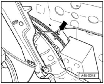 - Remove appropriate interior side trim, locate welding connection (arrow) and remove insulation bushing from welding connection.