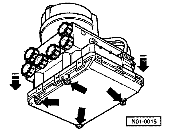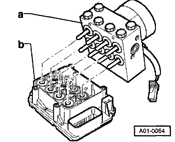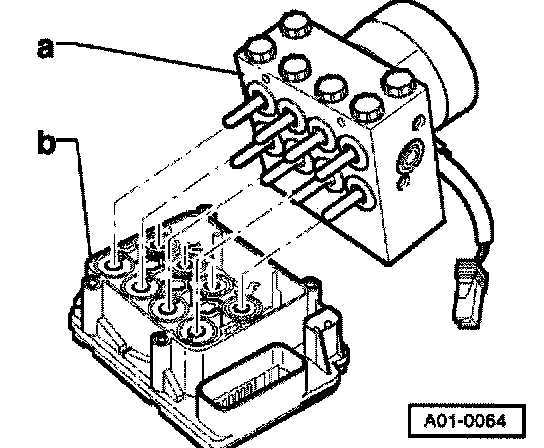 Servicing the hydraulic control unit is possible only by separating the control module - J104 - from hydraulic unit - N55 -, which is connected to hydraulic pump - V64 -. Faulty components can then be replaced.