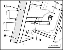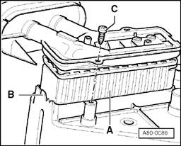 - When installing heater core, always secure it in the heater flap housing with two suitable screws -C- (e.g. self-tapping screws, 3.2 x 20 mm). This also applies even if the heat exchanger was originally only clipped in place.