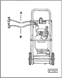- Connect red high pressure hose -A- of refrigerant recovery/recycling/recharging unit to high pressure service valve (fitting) on vehicle and open coupler valve.