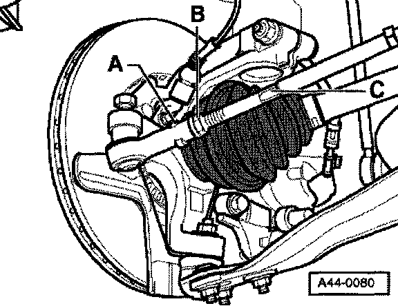 - Counterhold tie rod ball joint -A- with a 24 mm wrench when loosening and tightening lock nut -B-.