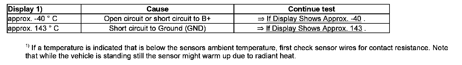 1) If a temperature is indicated that is below the sensors ambient temperature, first check sensor wires for contact resistance. Note that while the vehicle is standing still the sensor might warm up due to radiant heat.