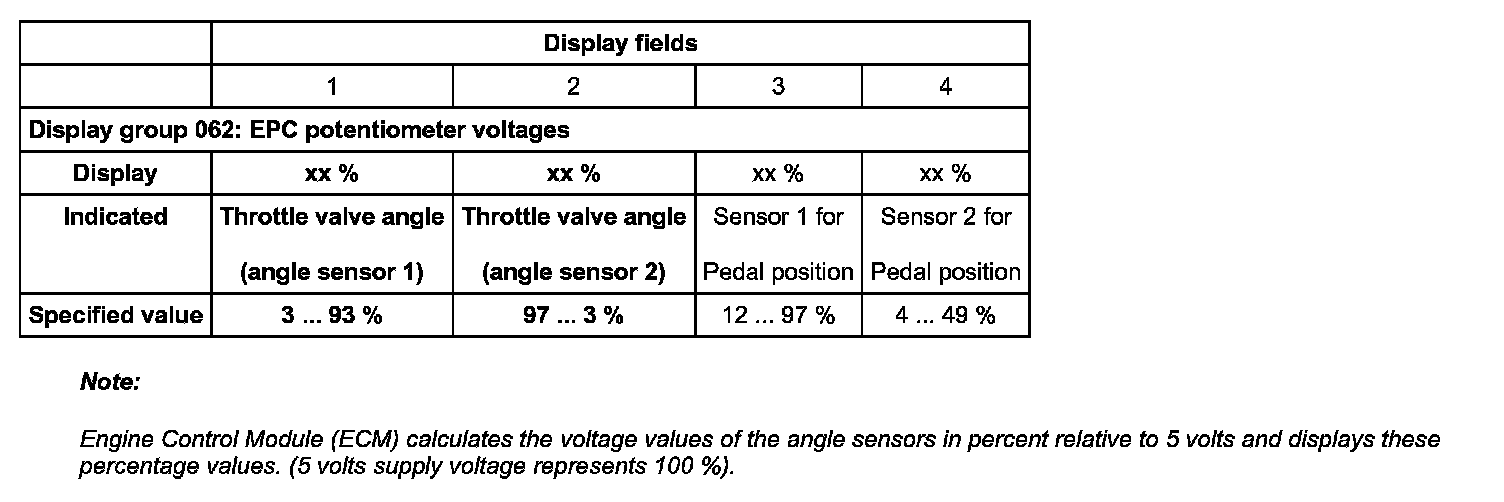 - Check specified values for EPC potentiometer (throttle valve angle sensor) voltages in display fields 1 and 2.