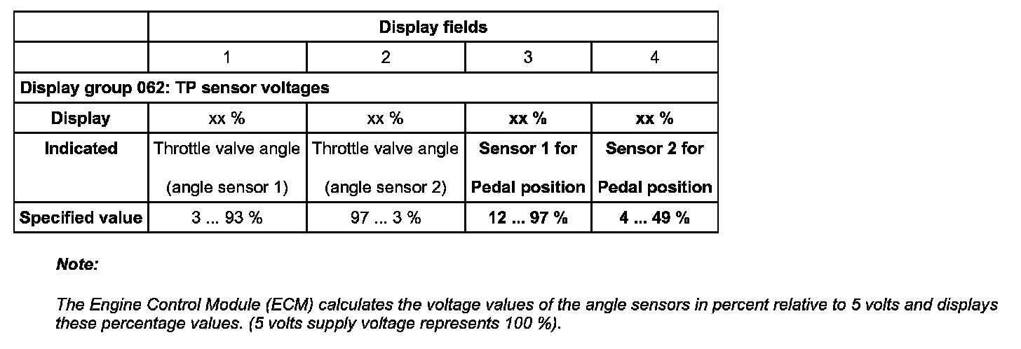 - Check specified values for TP sensor voltages in display fields 3 and 4.