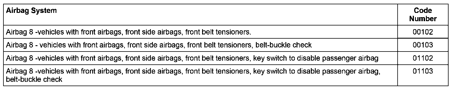 - 10102: Vehicles with front airbags, front side airbags and front belt tensioners, without key switch to disable passenger airbag