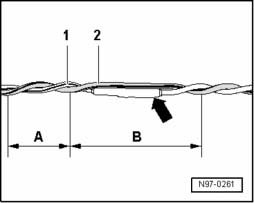 - When repairing, both wires to the airbag igniters must be the same length. When twisting the wires - 1 and 2 - together, the - A - = 20 mm routing length must be maintained.