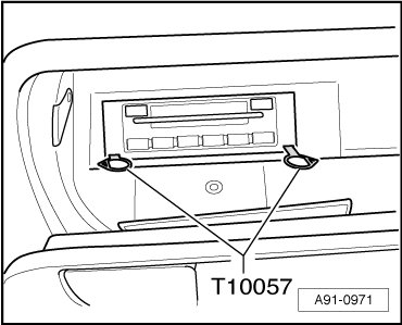 - Insert two clips on (T10057) in release slits on CD Changer (R41) until they engage. Points on the grip eyelets of tool face outward.