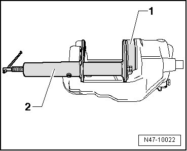 - Press the protective cap with the assembly tool - 1 - and the piston resetting tool - 2 - into the brake caliper so that it contacts the brake caliper all around.