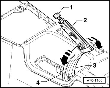 - Beginning at top, remove right trim - 3 - and left trim - 4 - in - direction of arrow - from parking brake lever.