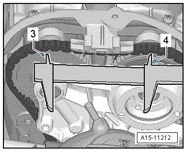 - Once the specified value is reached, measure the distance between the marking on the intake camshaft - 3 - and the marking on the exhaust camshaft - 4 -.