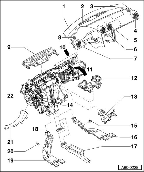 • If the Intermediate piece between heater and air duct in the instrument panel has been pinched during installation, the air guide to the front windshield is uneven or insufficient.