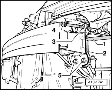 - Remove one of the two lower mounting bolts - 5 - of front end module at both longitudinal members and mark position of front end module - 2 - to mounting points on left and right longitudinal members e.g. using a suitable pin - 1 -.