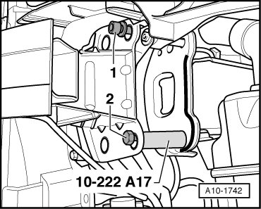 - Secure front end module against slipping at left and right using another bolt - 2 - (e.g. M 10 x 120) and a spacer tube (10 - 222 A /17).