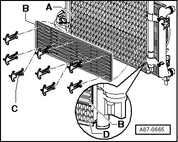 • Depending on version of vehicle, a stone deflector - B - may also be secured with clips - C - at lower area of condenser - A -.