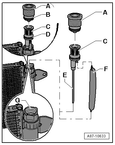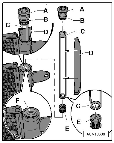 • The dryer cartridge - F - and the O-ring - B - are the same in all condenser versions. Should a repair set is not be available, either replace the condenser completely or use the parts from the repair set from another condenser (in this example, from the repair set from the condenser installed in the Audi A4 from MY 2008). Refer to the Electronic Parts Catalog. Clean the plastic screw - A - and the filter - C - (with the tube- E -) before using them again. The O-ring - D - only seal inside the circuit and can be used again in this single case if it is not damaged.