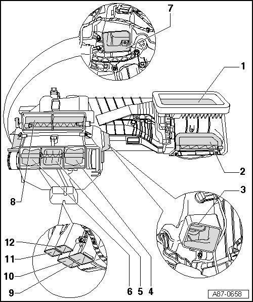 • Beginning November 2007, a heater air distribution housing with a door in the air outlet to the defroster vents in the instrument panel without a side cut-out is gradually being installed. On vehicles not equipped with A/C (just heating) or on vehicles equipped with a manual climate control system, this change has no impact on the heater control or on the manual A/C system (the door is operated by the heater controls and/or the manual A/C). Refer to => [ Air Distribution Housing Defroster Outlet Door ] Overhaul.