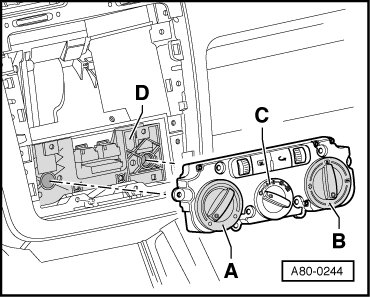 - Connect Bowden cable for temperature door onto base plate - A - (only present on vehicles without A/C system).