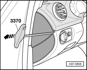 - Pry off the left cover on the instrument panel using (3370) - arrow -.