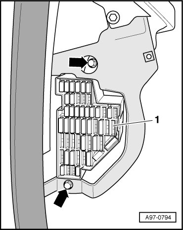 - Remove the screws - arrows - for fuse panel C (SC) - item 1 - on the driver side instrument panel.