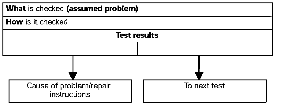 Starting with the reported problem, troubleshooting procedures show step-by-step what is checked and how it is checked in order to find the problem in the quickest and most reliable way. If several causes (of a problem) are possible in one system, a test procedure is used for diagnosis.
