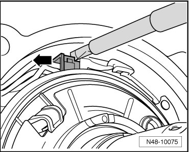 • A locking mechanism - arrow - for the spiral spring is located on the sensor wire in the steering gear housing. When removing the sensor wire, make sure the spiral spring does not twist.