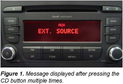 While scrolling through the CD function by pressing the CD button multiple times on the generation 2+ radio Chorus/Concert/Symphony, the message AUX EXT. SOURCE (auxiliary external source) appears in the display (Figure 1).