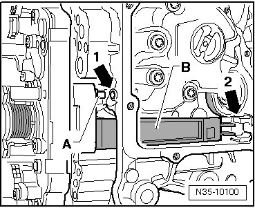 - Make sure the alignment pin - A - in the transmission housing - arrow 1 - and the sensor arm - B - in the guide - arrow 2 - fit correctly on the transmission housing.