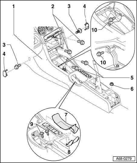 - Remove four bolts - 10 - around the gear lever, which secure the center console.