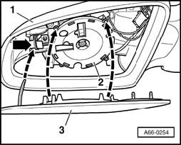 - Install mirror lens - 3 - with locking tabs onto mirror lens base - 2 - in - direction of arrow -.