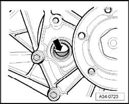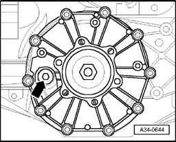 The oil level is correct when transmission is filled up to edge of housing - arrow -.