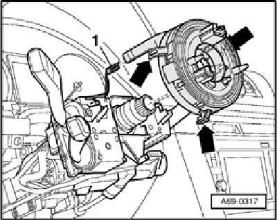 - Carefully release catch -arrows- and pull return ring with slip ring from steering column switch module (SCSM).