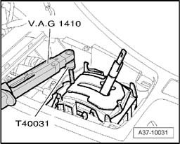 ^ Before adjusting the selector lever cable to basic setting make sure that clamping bolt has been tightened. The clamping bolt can be accessed via the hole in the selector mechanism, when in position "S". Use socket and key T40031 to tighten clamping bolt.