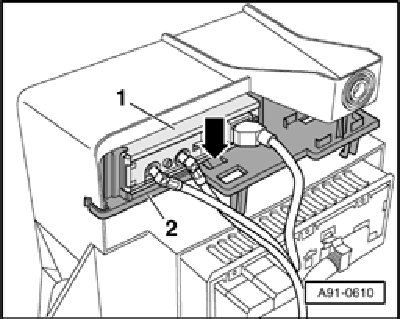 - Release Navigation Interface R94 - 1 - at catch - arrow - and remove from mounting plate - 2 -.