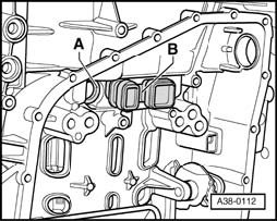 - Clip wiring harness - A - onto mechatronics unit - B - by first attaching tab - arrow - on reverse side of wiring harness to mechatronics unit.