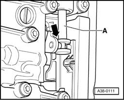 - While installing mechatronics unit without force, insert transmission selector lever stud - arrow - into groove on selector slide - A (move selector slide backward and forward if necessary).