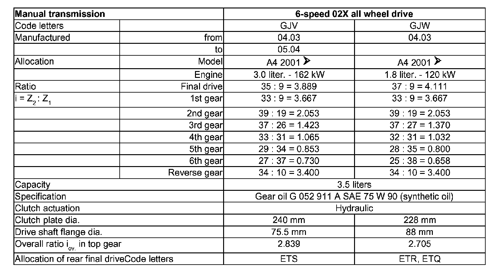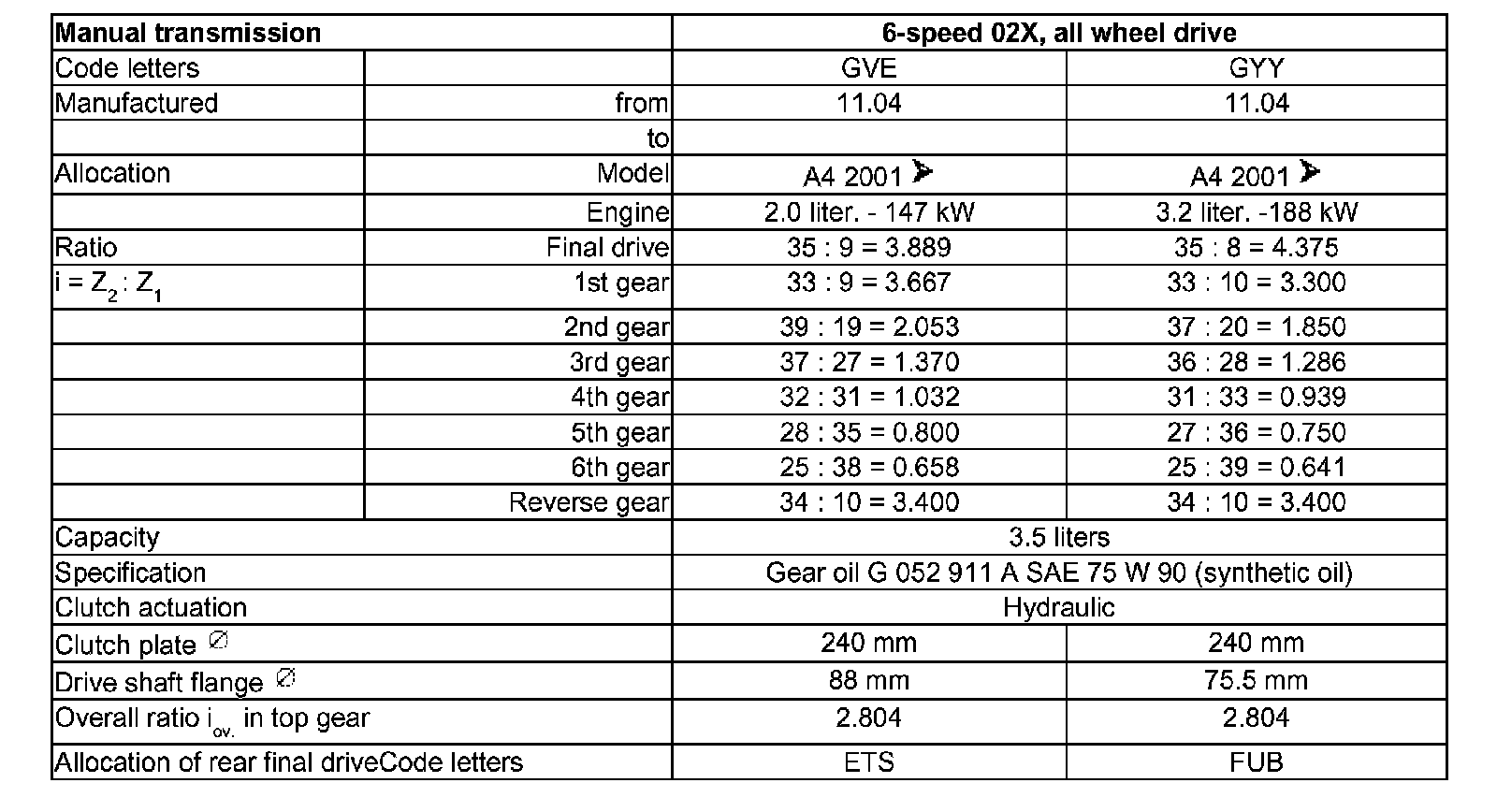Code letters, allocation, transmission ratios, capacities - 6 Spd. Manual Transmission 02X All Wheel Drive
