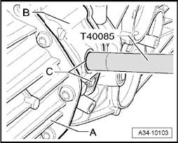 ^ Bolt bearing housing - B - with transmission cover - A - onto transmission housing prior to driving out and driving in locking bushings - C -.