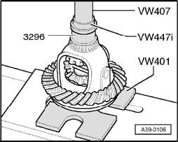 - Before setting up the puller, place thrust pad VW 447 H on differential cage.