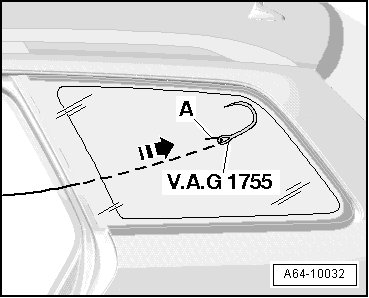 - Pull cutting cord end - A - inward (use pliers and protective gloves) to opposite window side with guide needle from ( V.A.G 1755) window removing kit.
