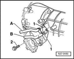 - Connect a hose approx. 18 mm dia. to ATF line - A - and secure with a hose clamp.