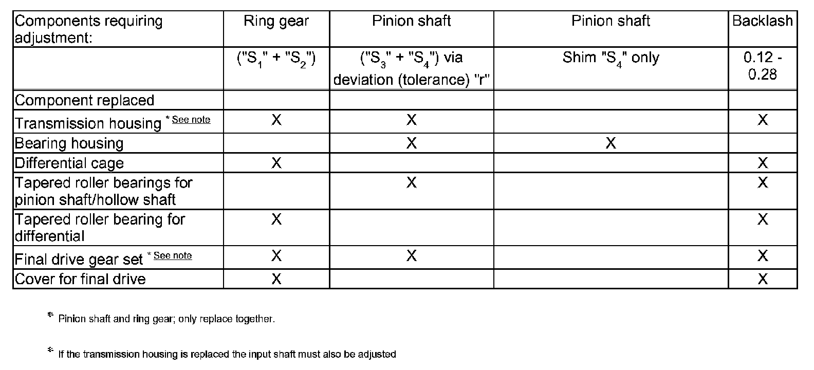 ^ If repairs have been performed to the transmission, it is only necessary to adjust the pinion shaft, ring gear or final drive set if components have been replaced which have a direct effect on the adjustment of the final drive. Refer to the following table to avoid unnecessary adjustment work: