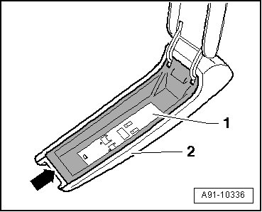 - Beginning at front - arrow -, carefully pry storage compartment - 1 - out of trim - 2 -.
