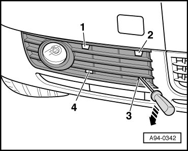 - Release catches -1- to -4- using a screwdriver -arrow and remove air intake grille on left and right on bottom part of bumper.