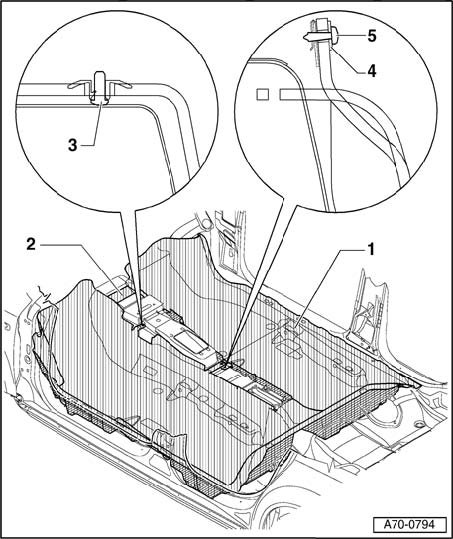- Before installing a new floor mat - 1 -, remove transport web - 2 -.
