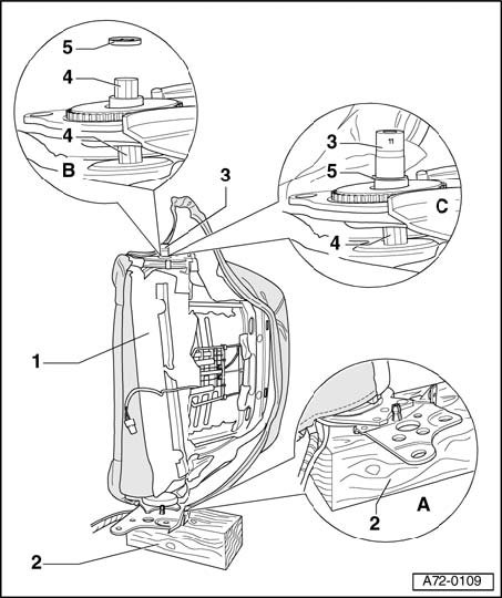 - Pry out spring washer - 5 - on side of backrest motor with a screwdriver (magnified area of illustration - B -.)