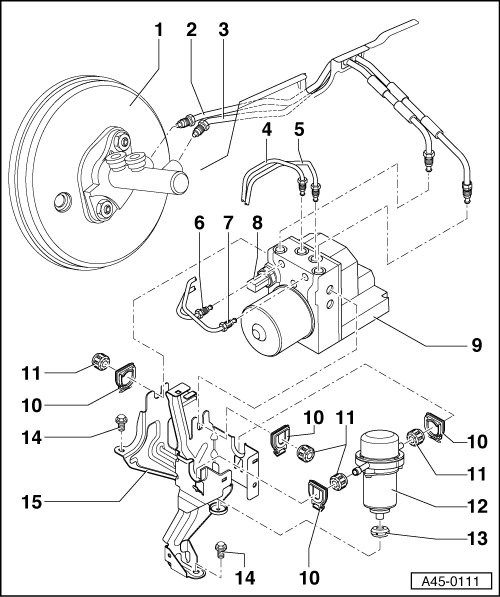 • Removing and installing, refer to => [ Hydraulic Control Unit, Bosch 5.7 ] Hydraulic Control Unit, Bosch 5.7.