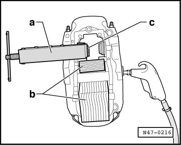 Only one piston can be forced out at a time. When doing this, hold the opposing piston in the caliper using the piston resetting tool (T10145) - a -. Block other pistons using a suitable item, such as a block of wood - b -. When using the piston resetting tool (T10145) place an additional piece of wood - c - between the tool and the piston to prevent damage to the piston when it is pushed out.
