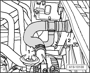 - Disconnect coolant hose - 2 - at upper left of radiator.