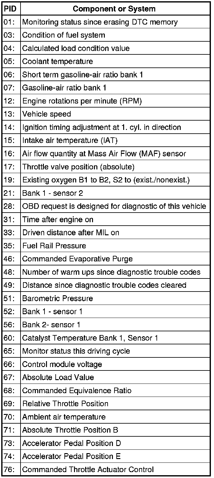 Diagnostic Mode 01 makes it possible to access current emissions-related measured values and diagnostic data. The original measured values (no replacement values), input and output data and system status information are displayed using Diagnostic Mode 1.