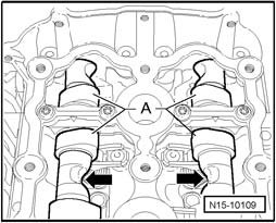 - Slowly turn intake camshaft with Toothed Belt Tensioner T10020 in direction of - arrow A - until camshaft adjuster fits onto camshaft.